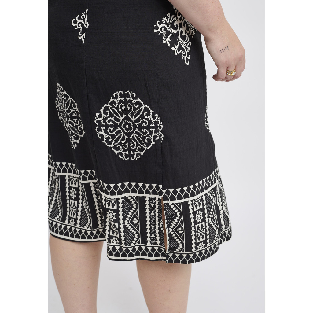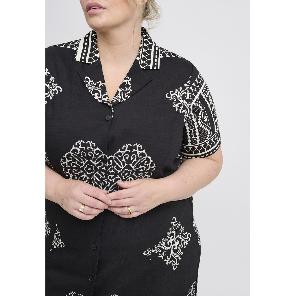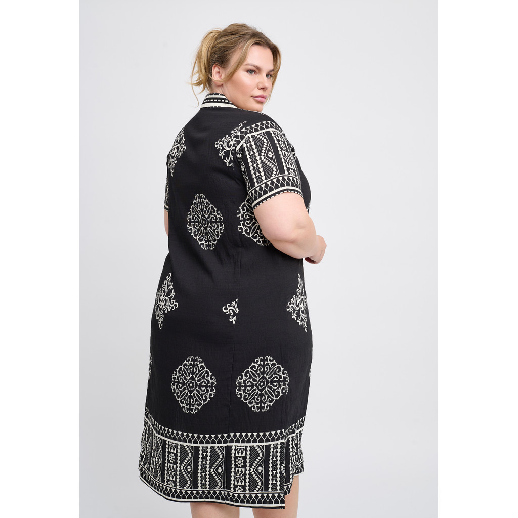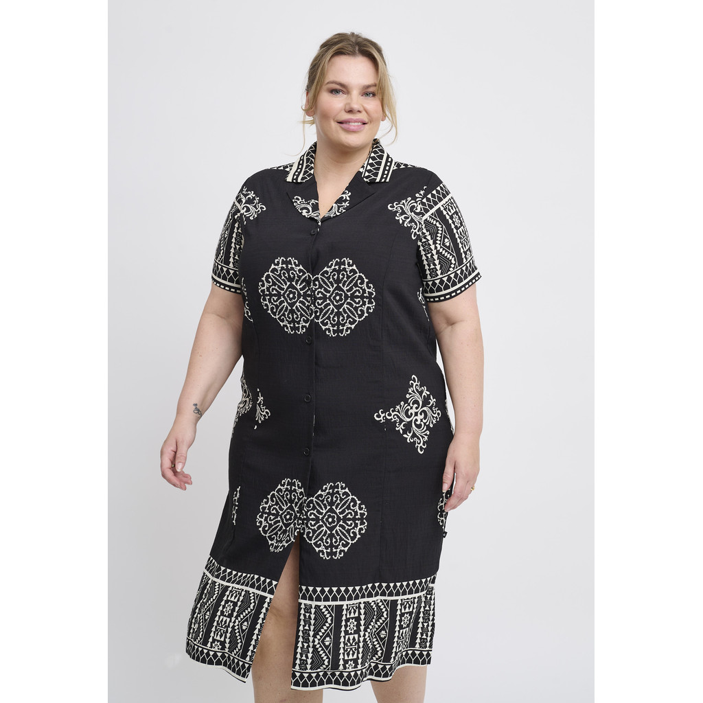 See Adia kleit on dekoratiivse ja omanäolise välimusega ning julge kontrastsetes värvides mustriga. See on valmistatud kergest kangast, mis langeb pehmelt ja loob mugava silueti. Kleidil on krae, lühikesed varrukad ja ees täispikk nööpkinnitus, samas kui sirge lõige annab sellele vaba ja moodsa ilme.