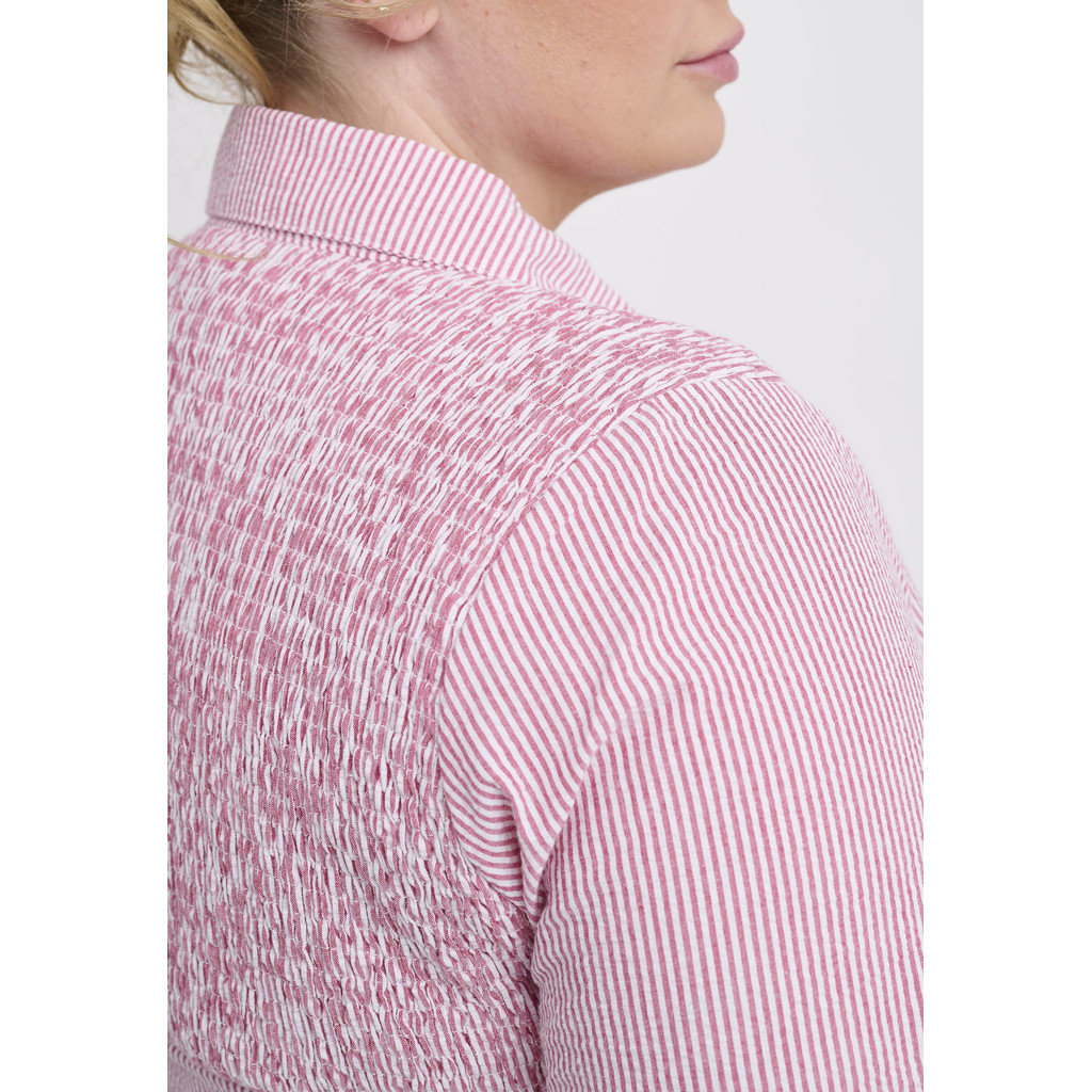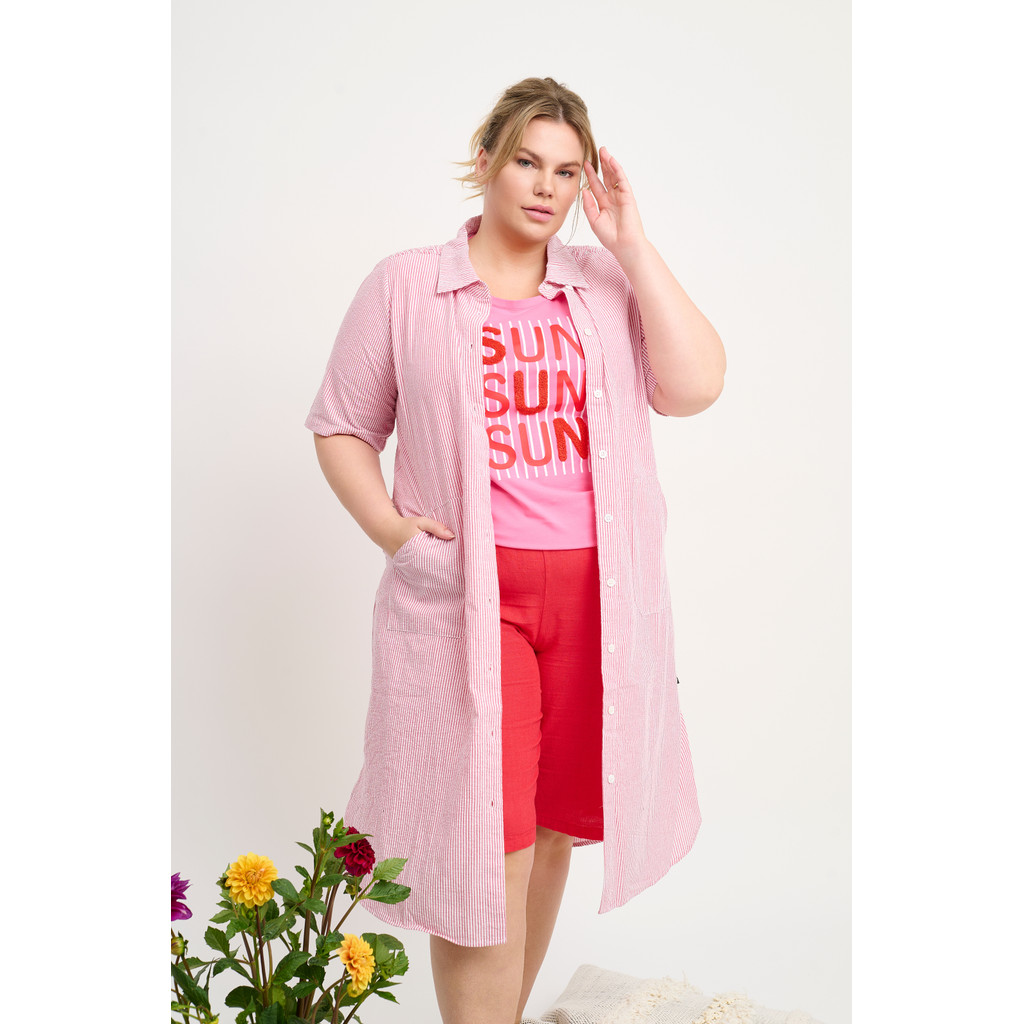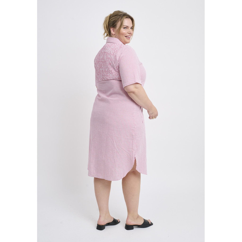 See Adia kleit on kerge ja suvise välimusega, lihtsa ja pingevaba siluetiga. See on valmistatud kergest puuvillasest materjalist, mis on naha vastas mugav ja loob õhulise ilme. Kleidil on krae, täispikk nööpkinnis ja lühikesed varrukad, samas kui kergelt vormitud lõige loob naiseliku ja pingevaba figuuri.