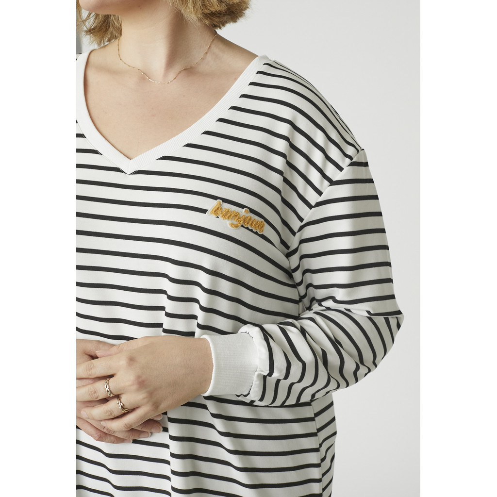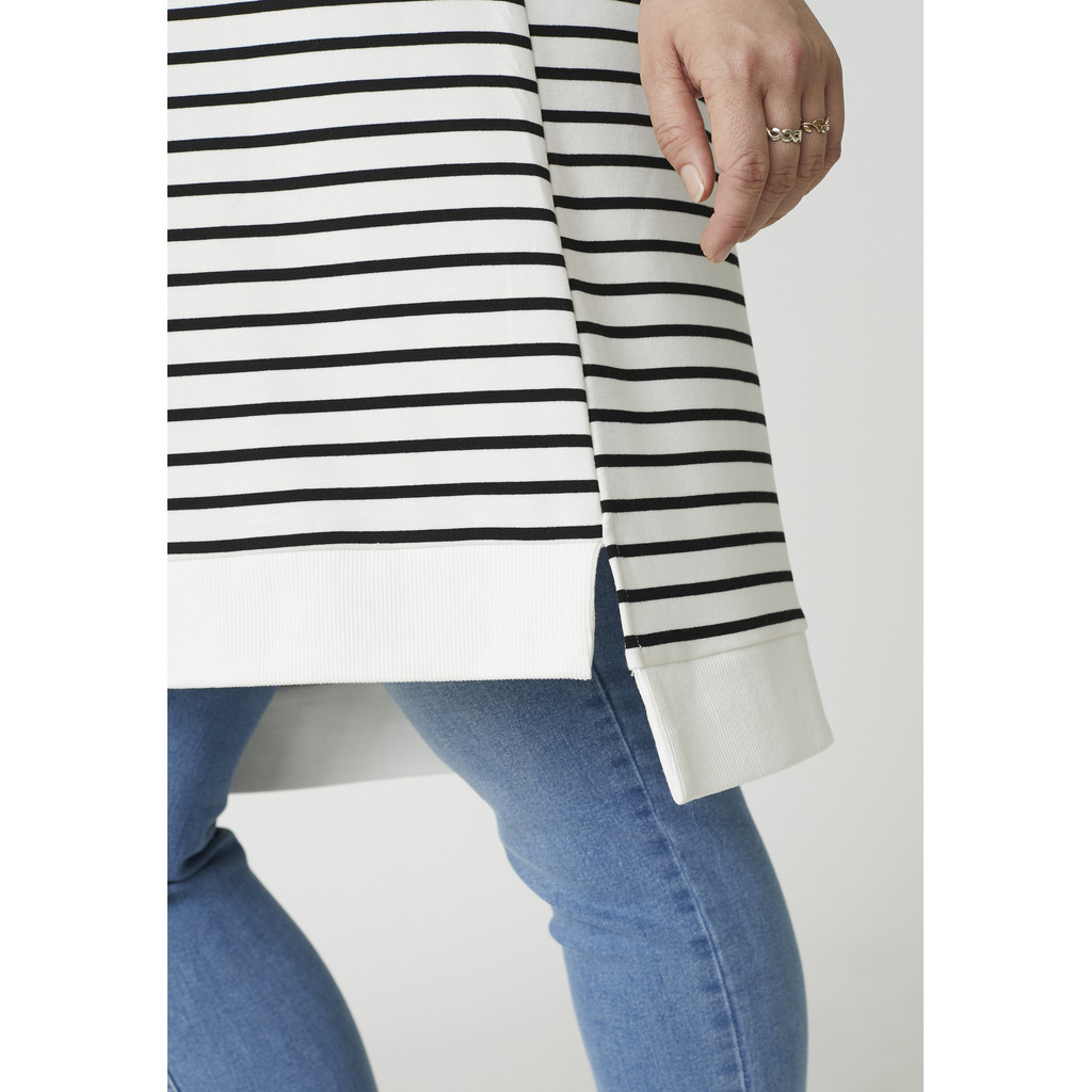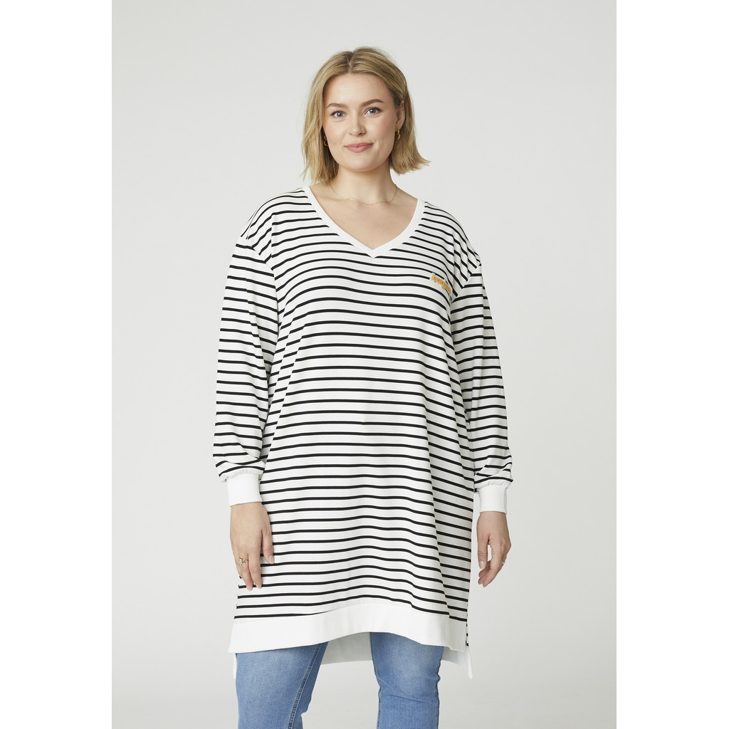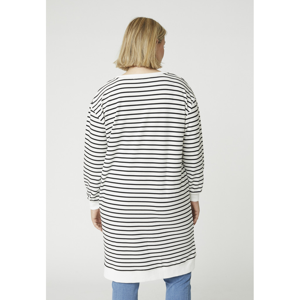 See Adia kootud kleit on oma ülisuure lõike ja klassikalise triibulise disainiga pingevaba ja moodsa välimusega. Valmistatud puhtast puuvillast, pakub see pehmet ja hingavat kvaliteeti, mis tunneb end kogu päeva jooksul mugavalt. Ümar kaelus ja pikad varrukad loovad puhta ja ajatu ilme.