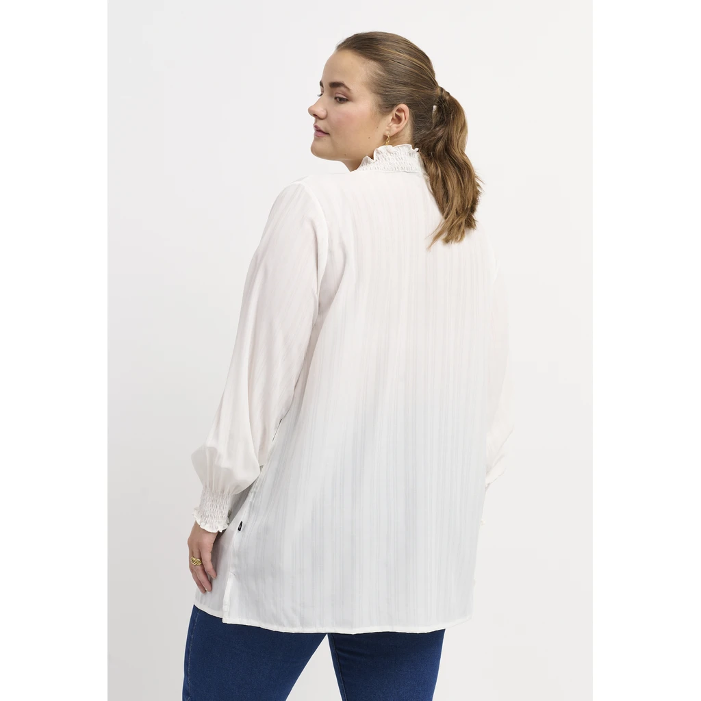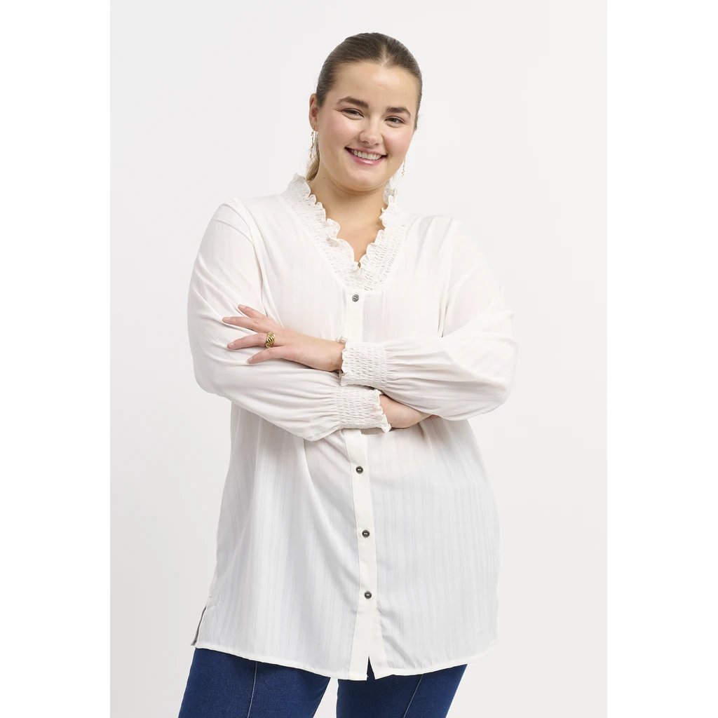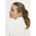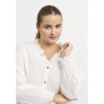 Naiselik ja klassikaline pluus vabaaja lõikega, peente detailide ja pehme ümara siluetiga. Mudelil on särgikrae, täispikk nööbirida ja pikad varrukad mansettidega – kõik valmistatud siledast materjalist, mis on nahal mugav.