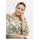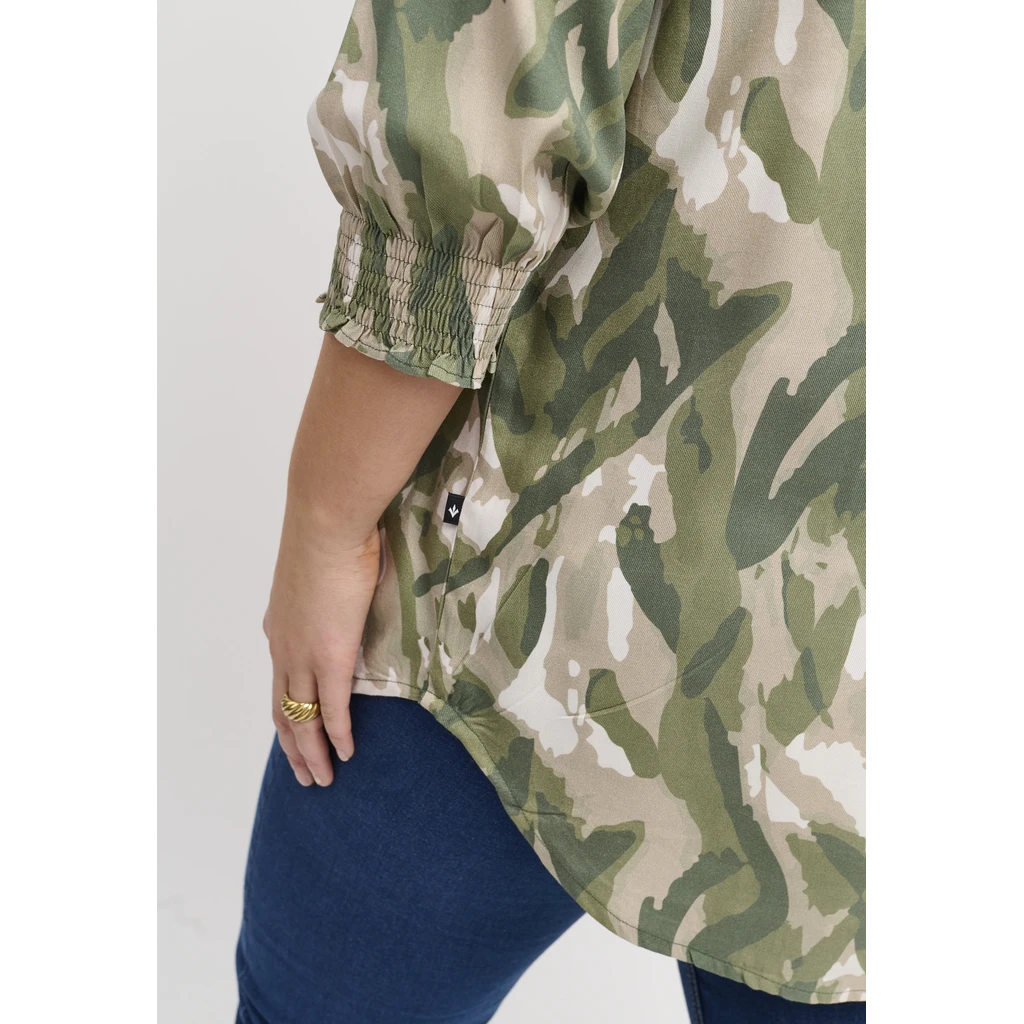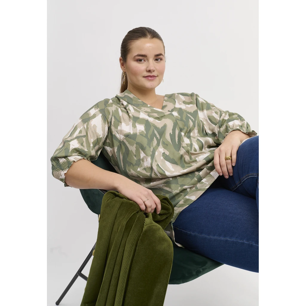 Õhuline ja stiilne Adia pluus, mis ühendab mugavuse loomuliku ja rafineeritud ilmega. Abstraktne muster rohelistes ja beežides toonides meenutab metsa rahulikke värve, lisades teie garderoobi värske hõngu. Pehme viskoosist twill tundub naha vastas luksuslik ja langeb kaunilt A-kujulise silueti järgi, võimaldades palju liikumisvabadust.