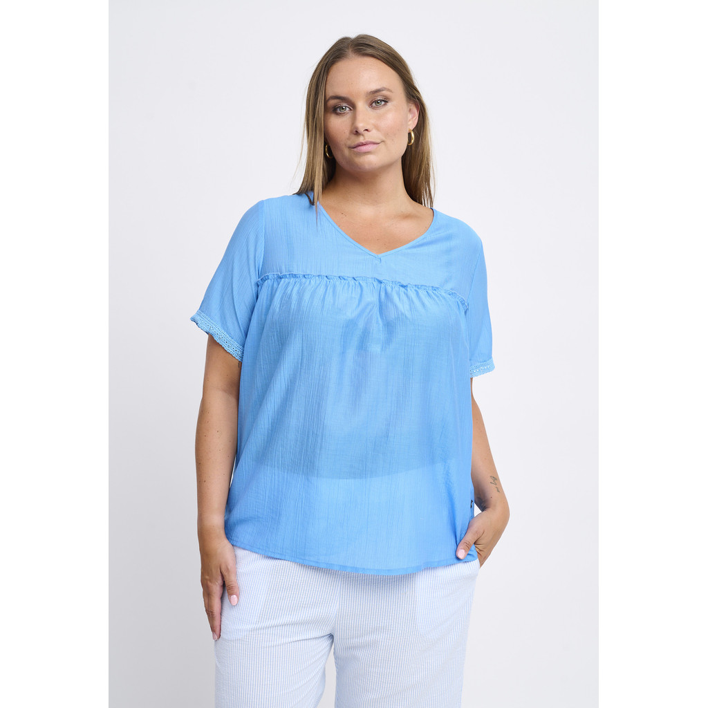 See Adia pluus on kerge ja naiseliku välimusega, õrnade kortsdetailidega rinnal. See on valmistatud kergest viskoosist, mis langeb pehmelt ja loob õhulise ilme. Pluusil on V-kaelus ja lühikesed varrukad, samas kui A-kujuline lõige pakub meelitavat langemist ja liikumisvabadust.