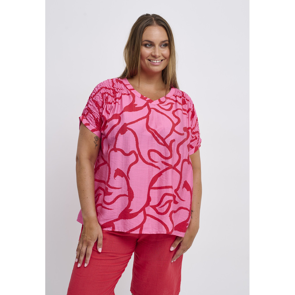 See Adia pluus on elava ja moodsa välimusega ning suure graafilise mustriga. See on valmistatud kergest kangast, mis langeb pehmelt ümber keha ja loob õhulise ilme. Pluusil on ümar kaelus ja lühikesed varrukad, samas kui A-kujuline lõige loob pingevaba ja meelitava silueti.