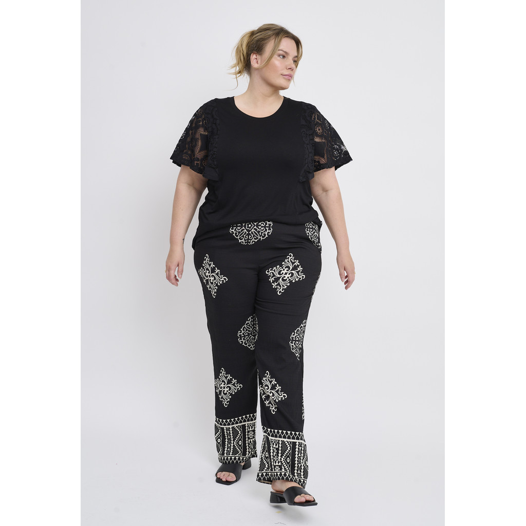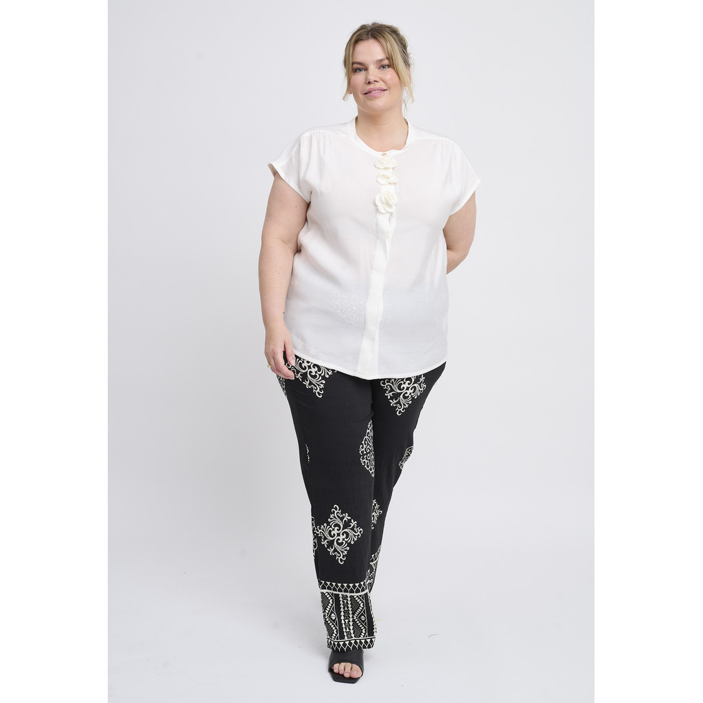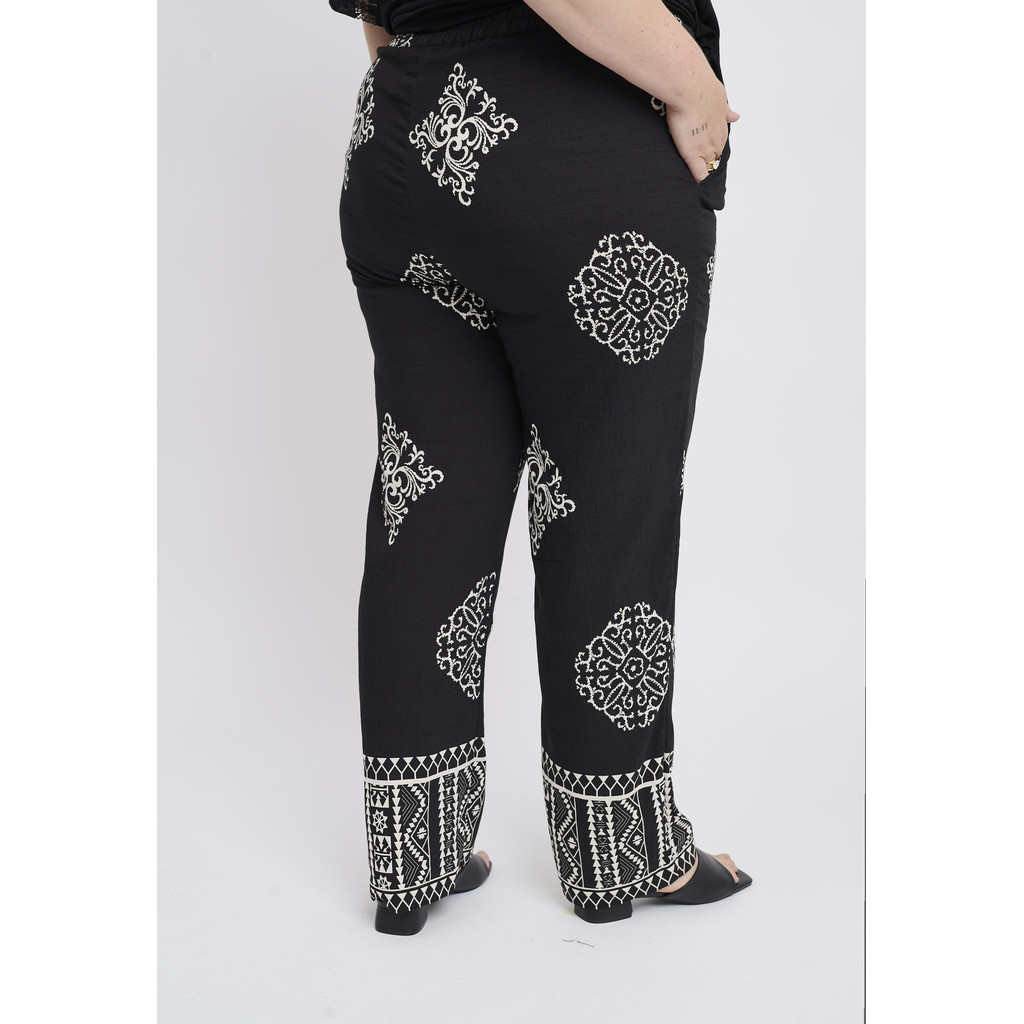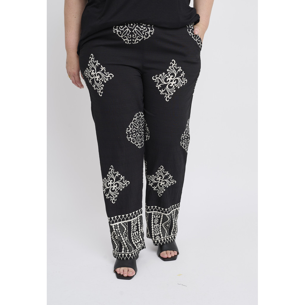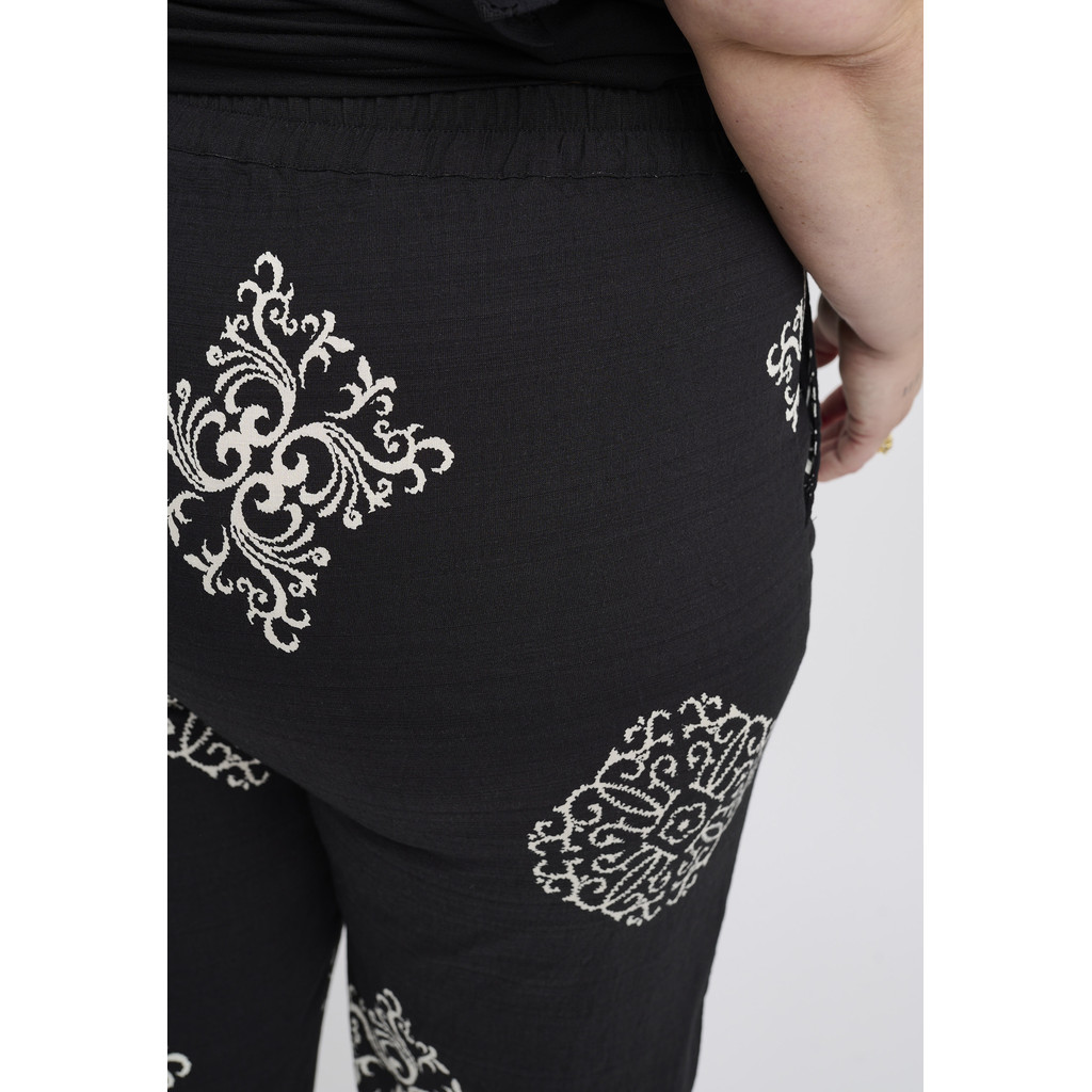 Need Adia püksid on dekoratiivse ja pingevaba välimusega ning graafilise mustriga, mis loob elava ilme. Need on valmistatud kergest ja mugavast viskoosist, mis langeb pehmelt ümber keha ja võimaldab vaba liikumist. Sirge lõige loob meelitava silueti, samas kui kontrastne muster lisab iseloomu ja naiselikkust.
