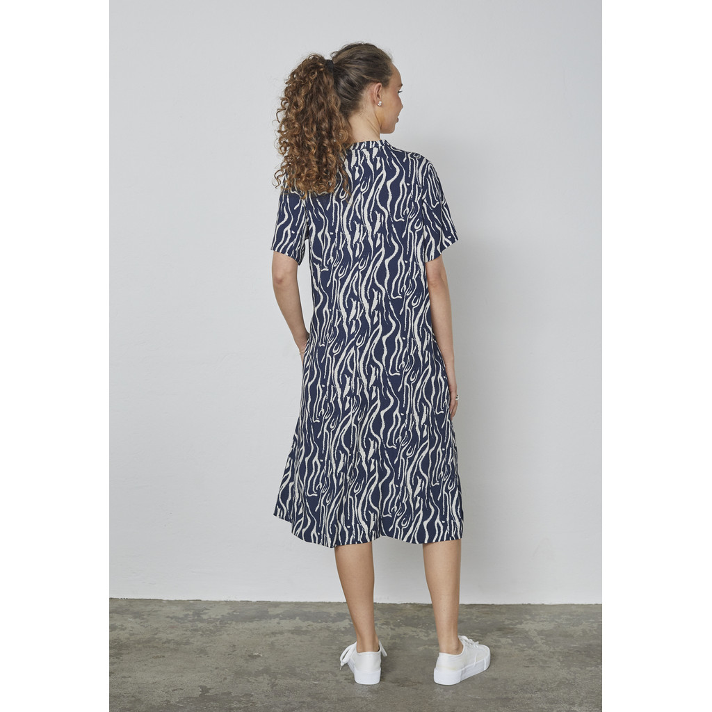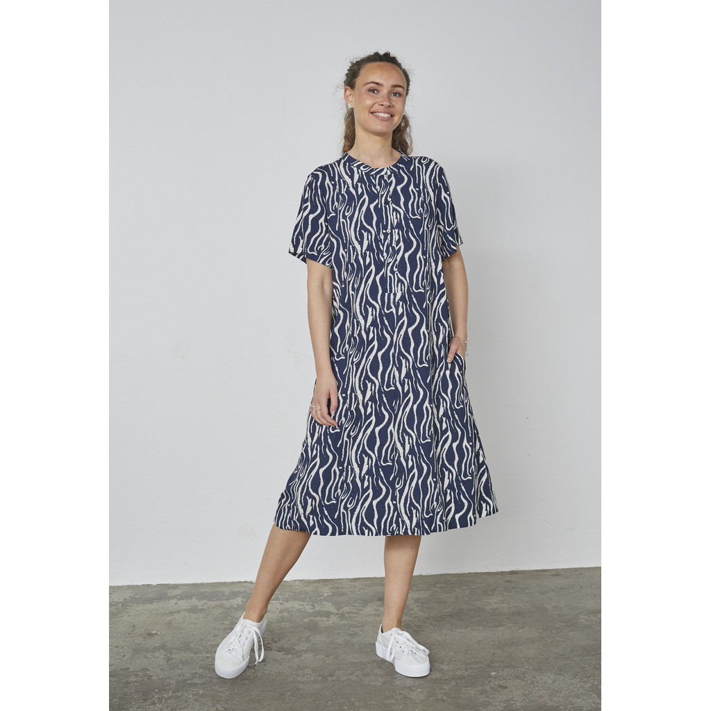 See Eltoni kleit on peene mustriga ja elegantse A-lõikelise siluetiga, mis langeb kaunilt ümber keha. Detailne muster lisab sügavust ja eksklusiivset tunnet, samas kui pehme viskooskangas kerge venivusega tagab mugavuse ja graatsilise liikumise. Naiselik ja tasakaalustatud stiil ajatu ilmega.