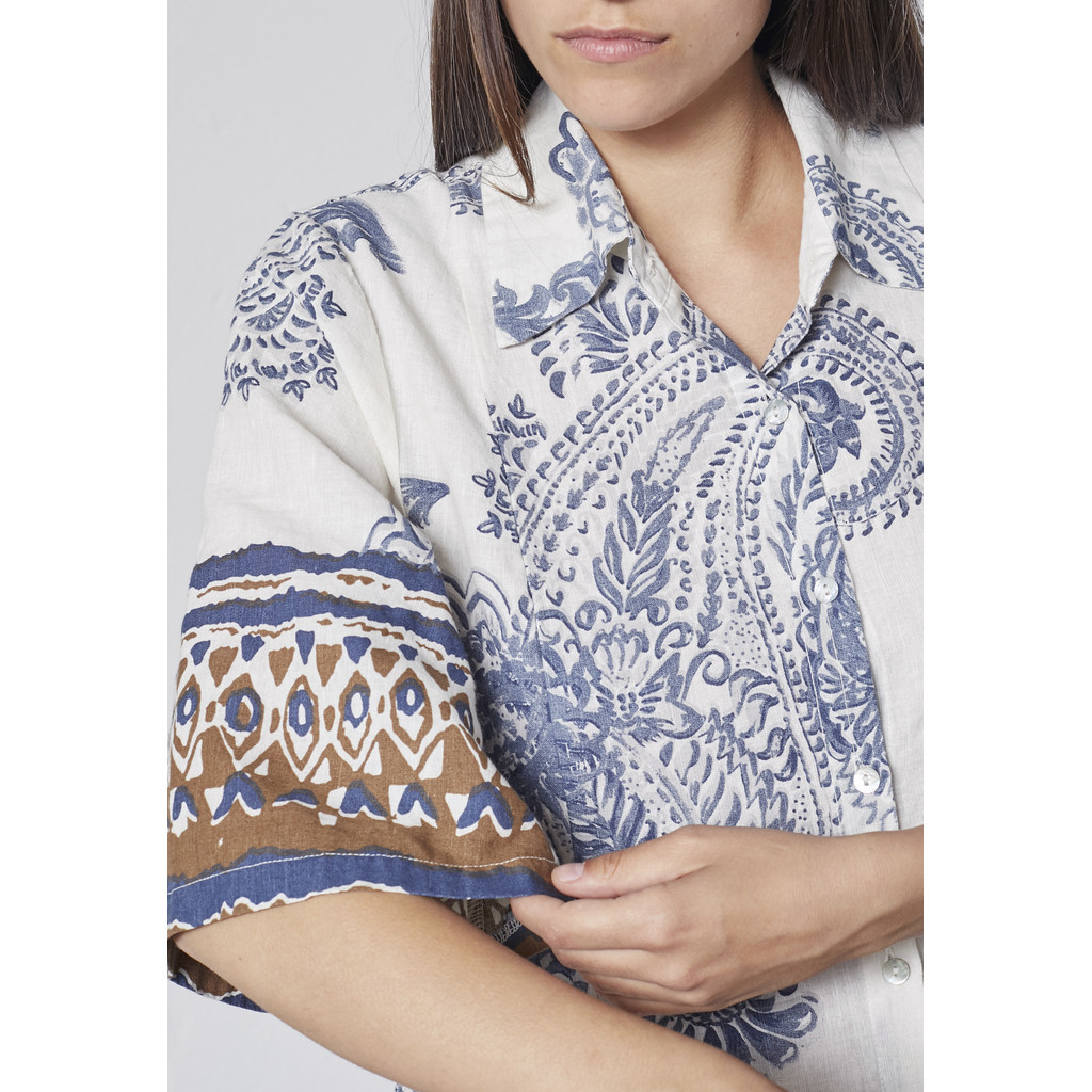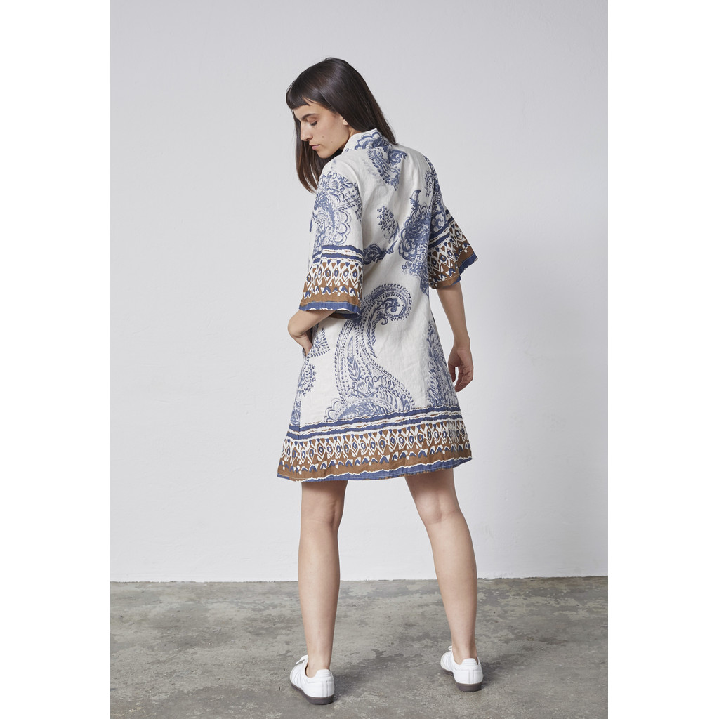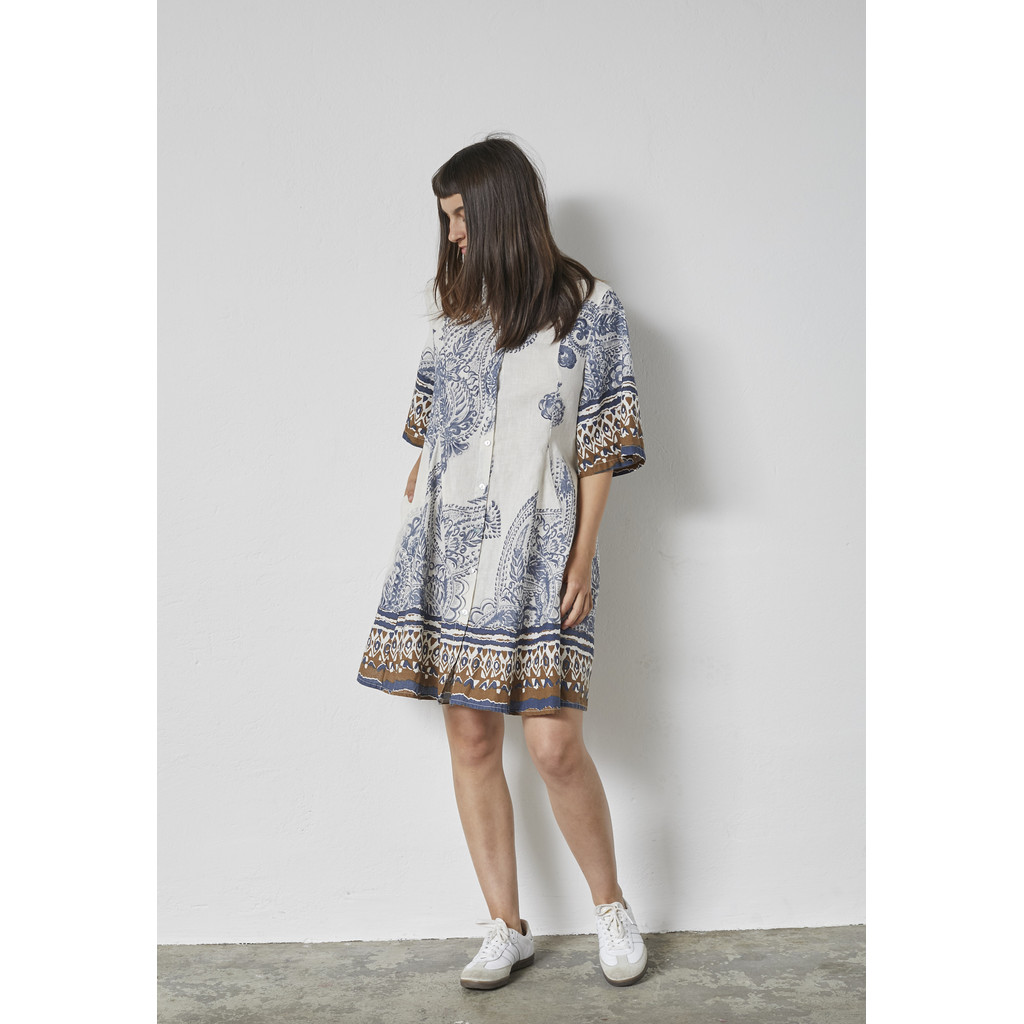 See Lindi kleit on kerge, boheemlaslikust stiilist inspireeritud ja pingevaba elegantsiga. Valmistatud 100% linasest kangast, pakub see õhulist ja mugavat kvaliteeti, loomulikult langevat ja kaunist tekstuuri. Kleidil on klassikaline lõige, 3/4 pikkused varrukad ja dekoratiivne muster, mis lisab elavat ja naiselikku hõngu. Lihtne stiliseerida ning see sobib ideaalselt nii sooja igapäevaseks riietuseks kui ka suvisteks pidulikumateks riieteks.