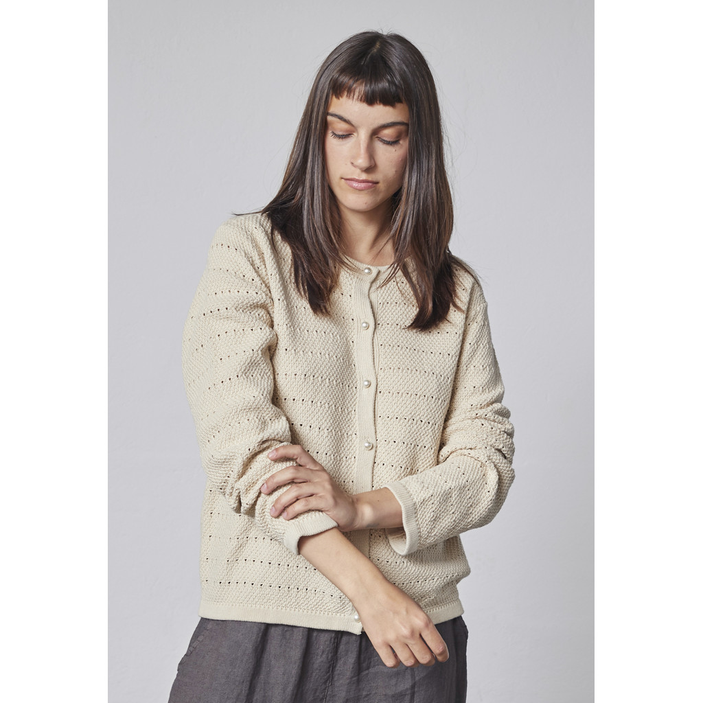 See Lindi kootud kardigan pakub rahulikku ja ajatut välimust, mida iseloomustavad puhtad jooned ja peened detailid. See on valmistatud puhtast puuvillast ning on pehme ja mugava kvaliteediga, mis teeb selle kandmise kogu päeva jooksul lihtsaks. Suletud esiosa ja lihtne disain loovad pingevaba, kuid samas tervikliku välimuse.