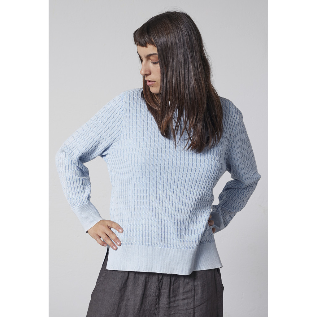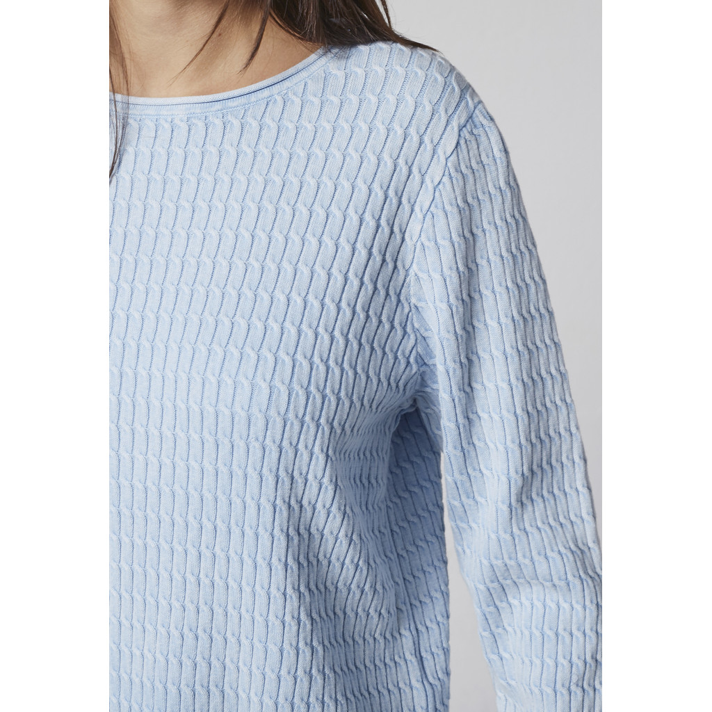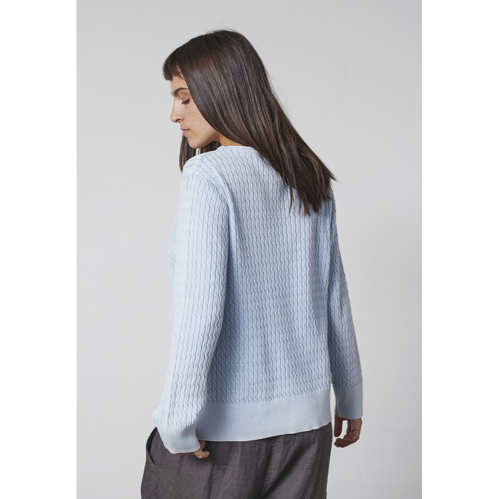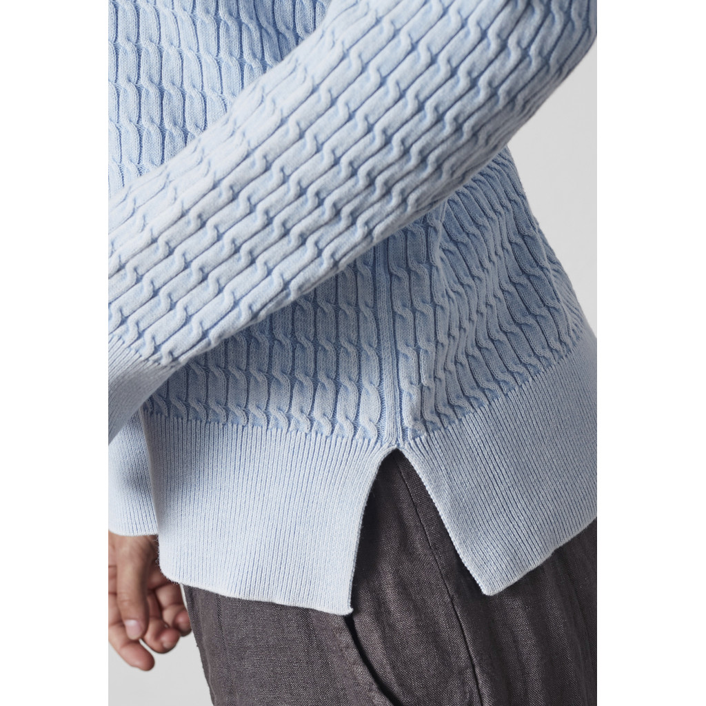 See Lindi kootud pullover on klassikalise ja naiseliku disainiga ning puhta ja elegantse välimusega. See on valmistatud puhtast puuvillast, pakkudes pehmet ja mugavat tunnet ning head hingavust. Lihtne pind ja klassikaline lõige muudavad selle kandmise mugavaks nii igapäevaseks kandmiseks kui ka pidulikumatel puhkudel.