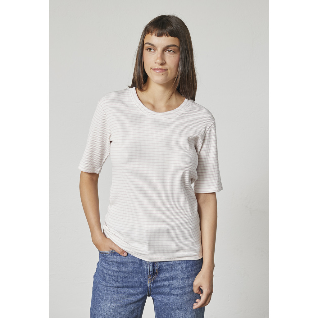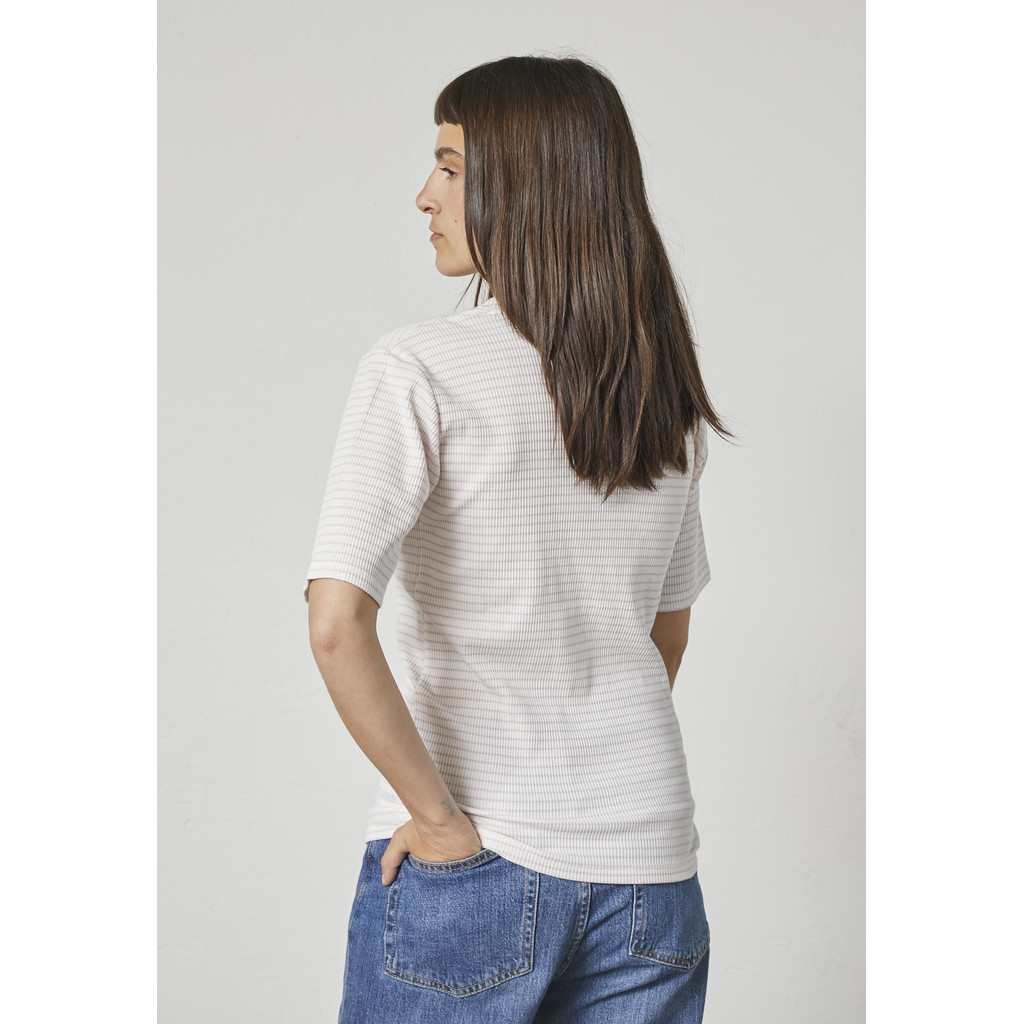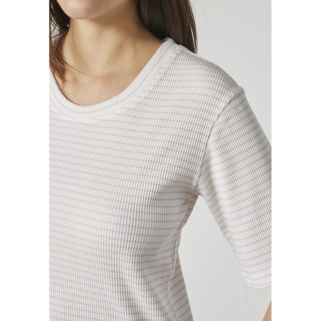 See Lindi lühikeste varrukatega T-särk on puhta ja pingevaba välimusega ning peenete triipudega, mis lisavad õrna visuaalset detaili. See on valmistatud pehmest ja venivast puuvillasegust, pakkudes mugavat istuvust ja head liikumisvabadust. Peened triibud lisavad diskreetset iseloomu, samas kui ümar kaelus ja lihtne kuju muudavad disaini kandmise lihtsaks.