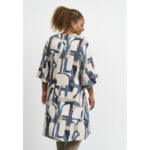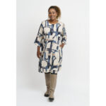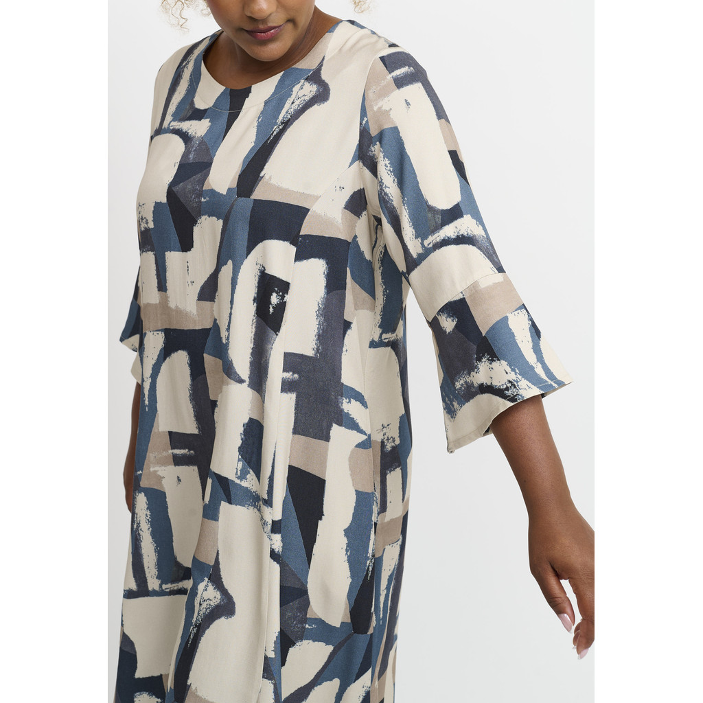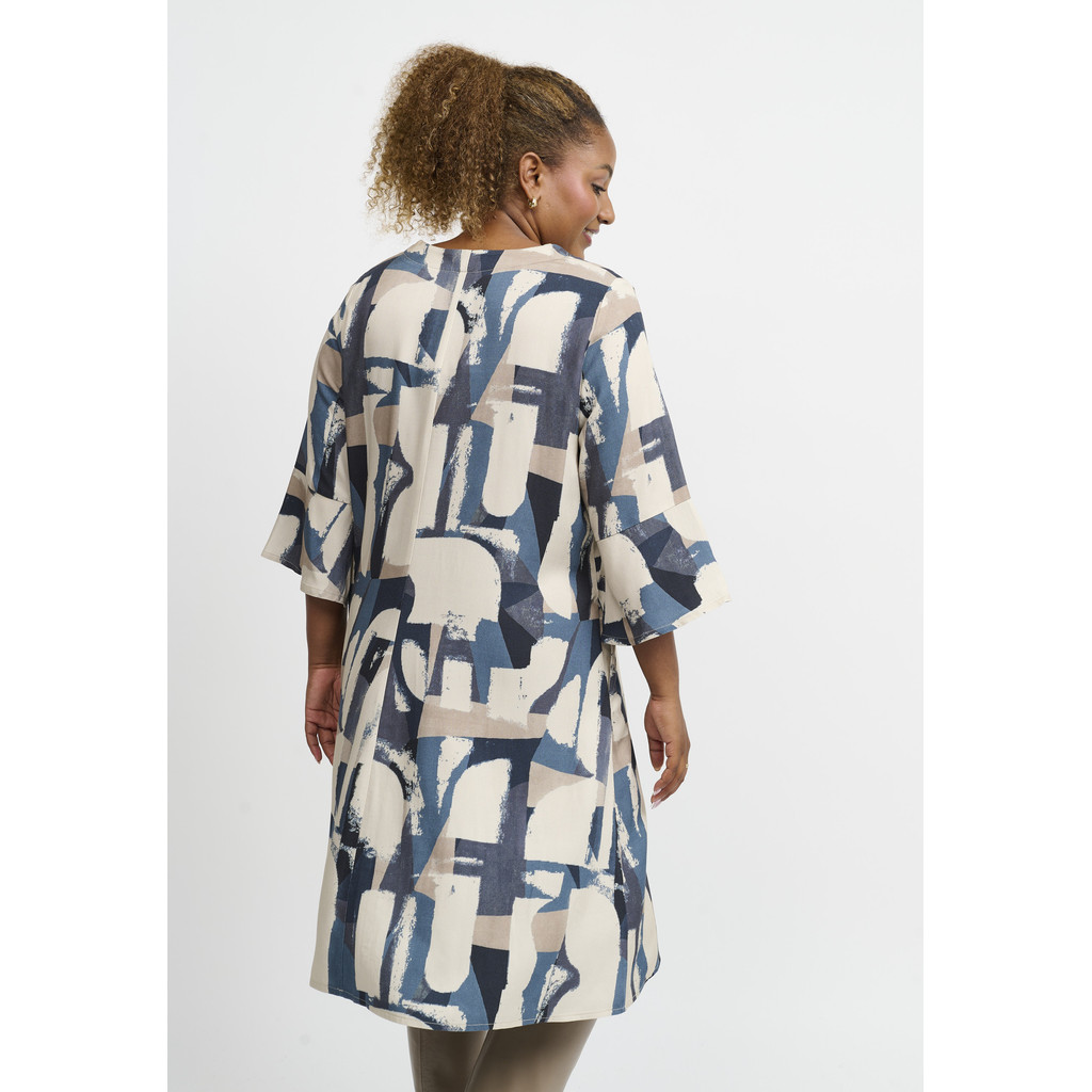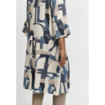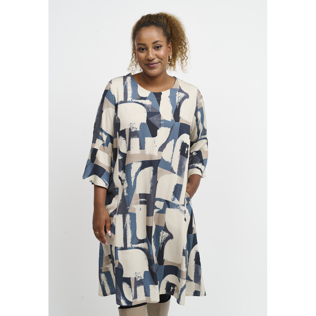 Moodne ja kerge kleit erksa graafilise mustriga pehmetes kreemikates, sinistes ja roosades toonides. Sellel on lai A-lõikeline siluett, kolmveerandvarrukad ja ümar kaelus, mis loovad naiseliku välimuse. Puhas viskoosmaterjal tundub nahal pehme ja annab kleidile kauni voolavuse.