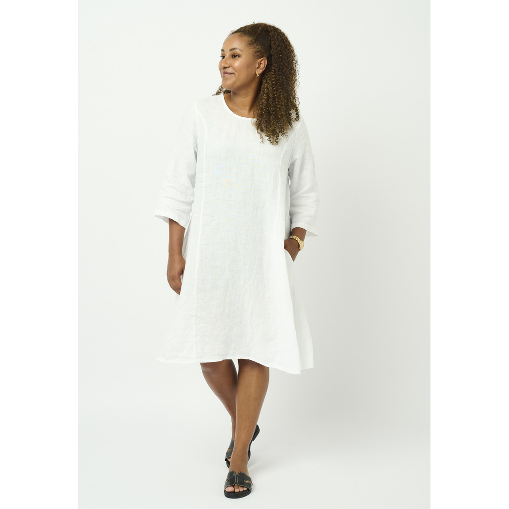 Kaunis kleit ümara kaelusega, kolmveerandpikkuste trompetvarrukatega ja küljetaskutega. Kleidil on naiselik siluett ja ühevärviline disain. See on A-kujulise ja laia lõikega ning valmistatud mõnusast ja hingavast linasest kangast.