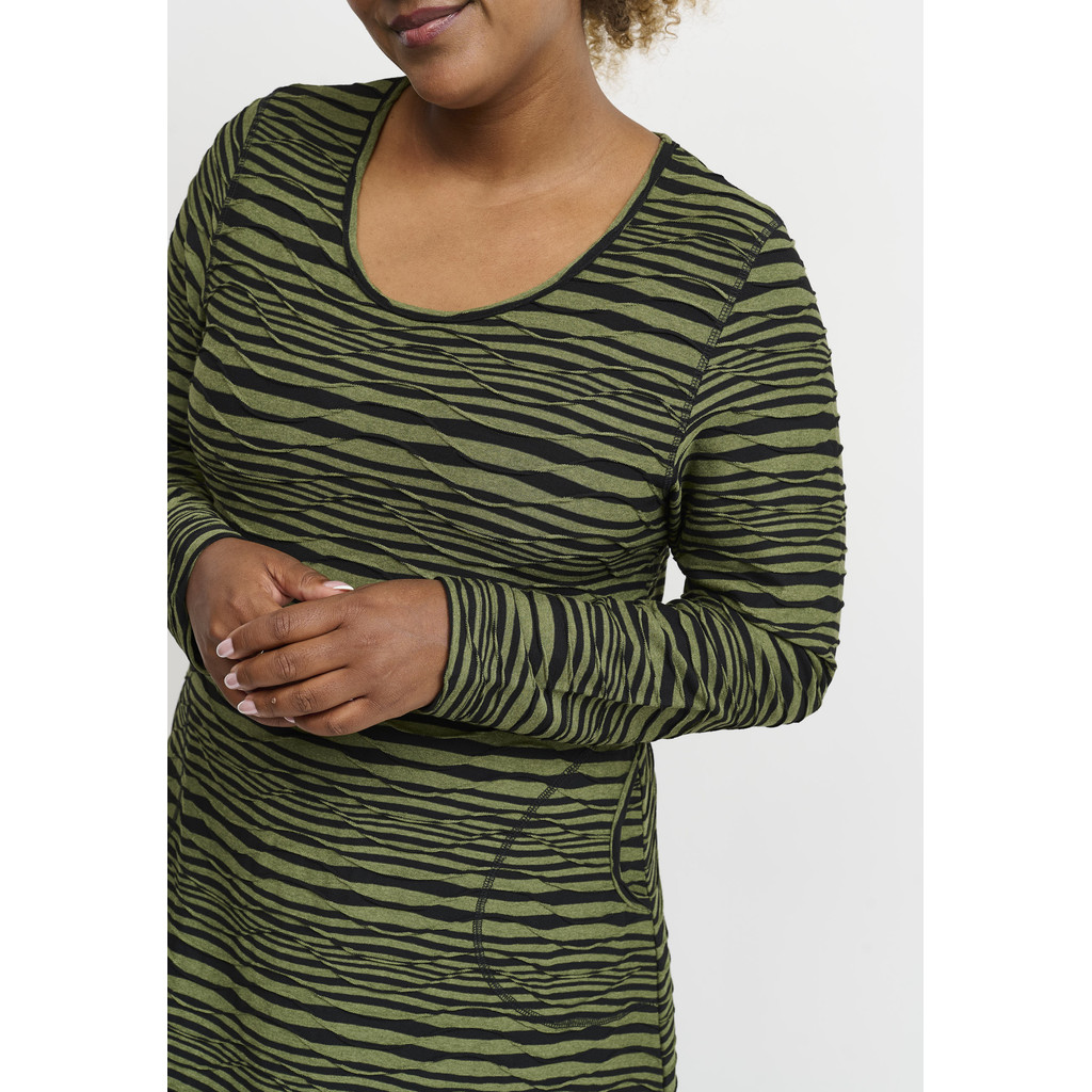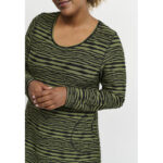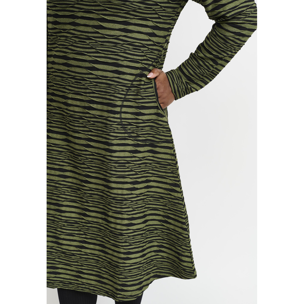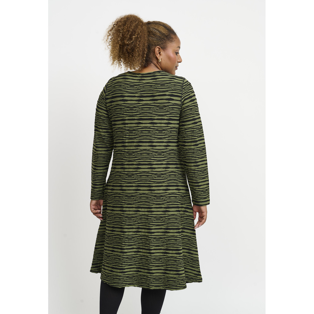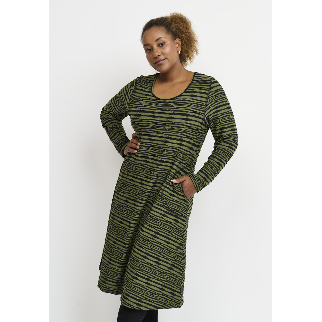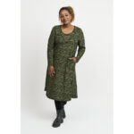 Kaunis sooja rohelise tooniga kleit graafilise mustriga, mis lisab tekstuuri ja erksust. Klassikaline A-lõikeline siluett, pikad varrukad ja ümar kaelus muudavad selle nii meeldivaks kui ka mugavaks. Pehme ja veniv viskoosmaterjal istub õrnalt, ilma et see tekitaks pinget.