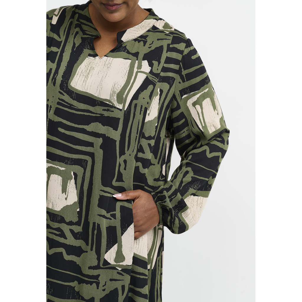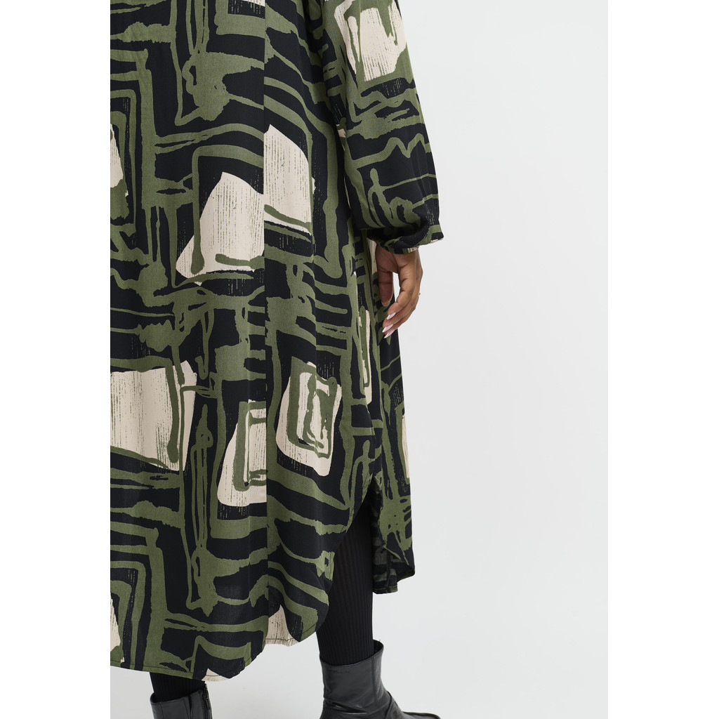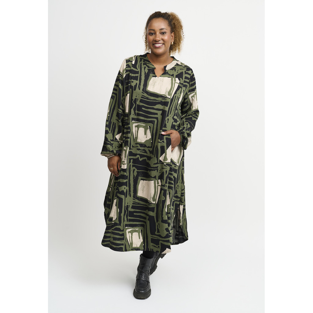 Pikk ja õhuline kleit iseloomuliku sügavrohelise ja neutraalsete toonidega graafilise trükimustriga. Meelitav A-lõikeline lõige ja kerge viskooskangas pakuvad kaunist langevust ja palju liikumisvabadust. Pikkade varrukate, ümara kaeluse ja praktiliste küljetaskutega on see nii funktsionaalne kui ka stiilne.