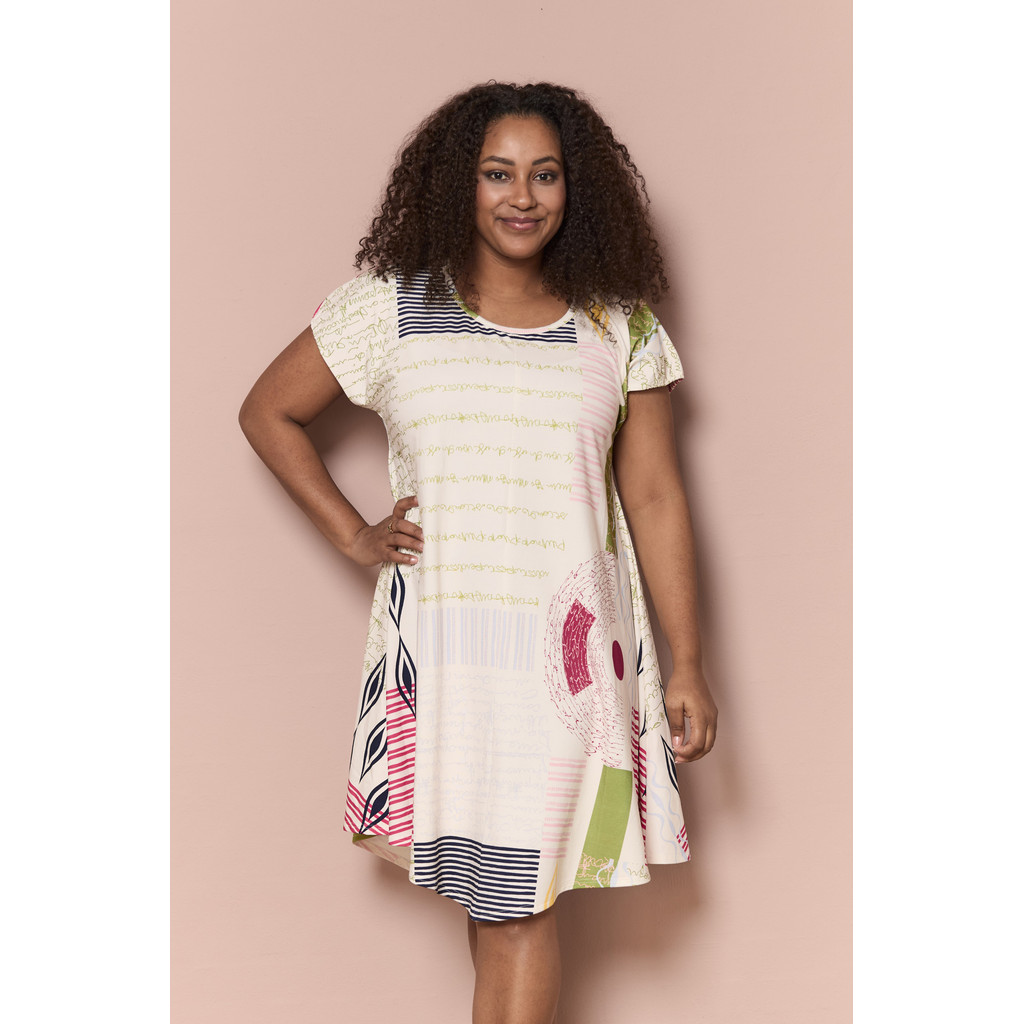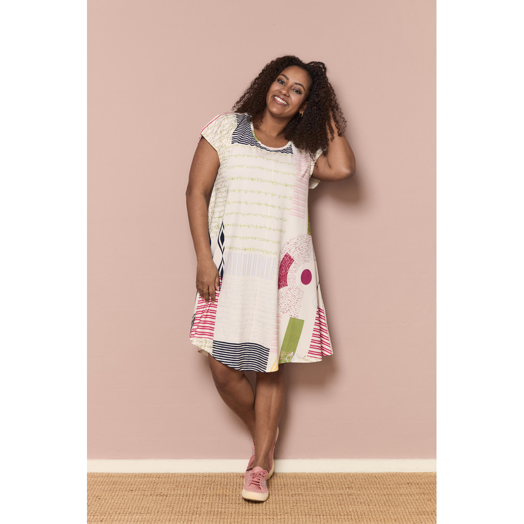 Kaunis kleit mängulise ja värvika mustriga, mis lisab värske ja suvise tunde. Pehme ja veniv kangas tagab mugava istuvuse, mistõttu sobib see ideaalselt nii igapäevaseks kandmiseks kui ka vabaks ajaks. Kleidil on lühikesed varrukad ja ümar kaelus, samas kui A-kujuline lõige annab kerge ja meelitava silueti, mis langeb pehmelt ümber keha.