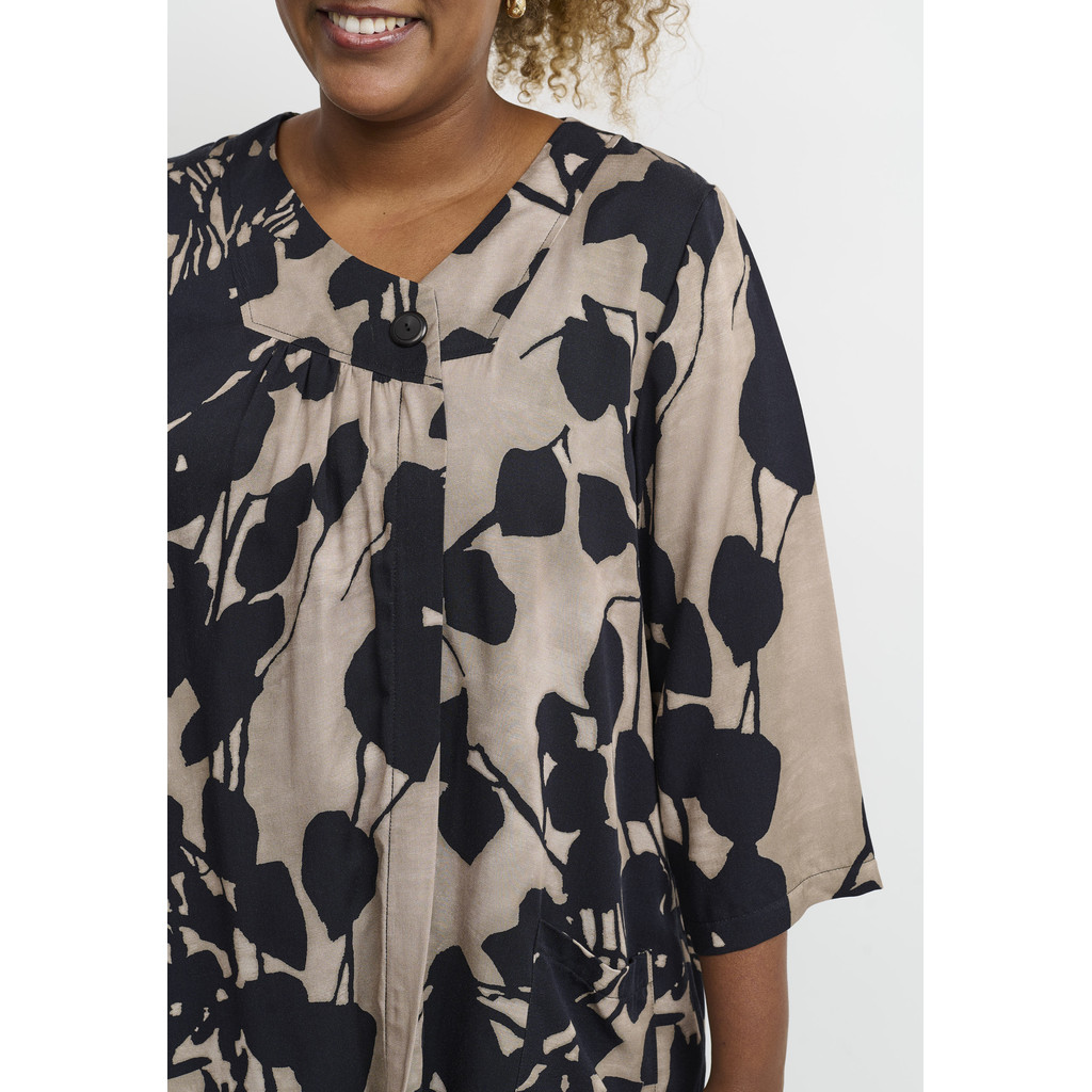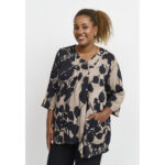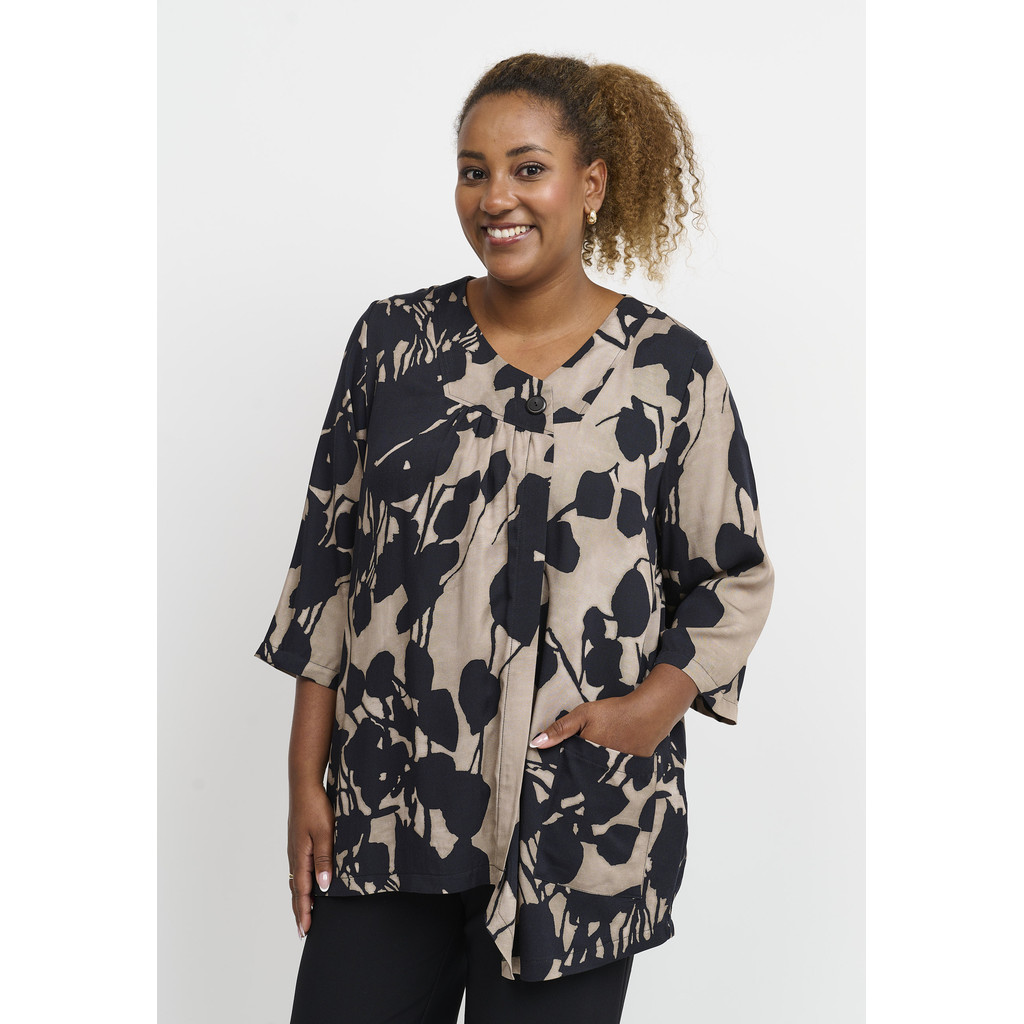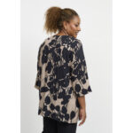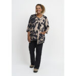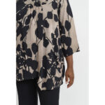 Elegantne ja avar pluus, millel on suur graafiline lilleprint pehmetes kontrastsetes toonides. Pluusil on sirge ja lai lõige, mis langeb kaunilt üle keha, luues pingevaba ja naiseliku ilme. Pehme viskooskangas tundub naha vastas kerge ja mugav, mistõttu sobib see ideaalselt nii igapäevaseks kandmiseks kui ka pidulikumateks sündmusteks.