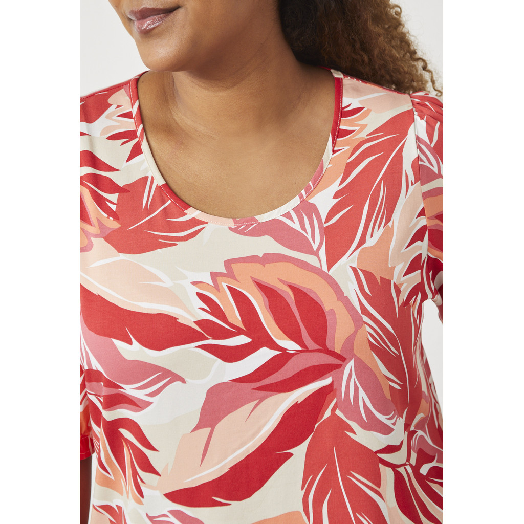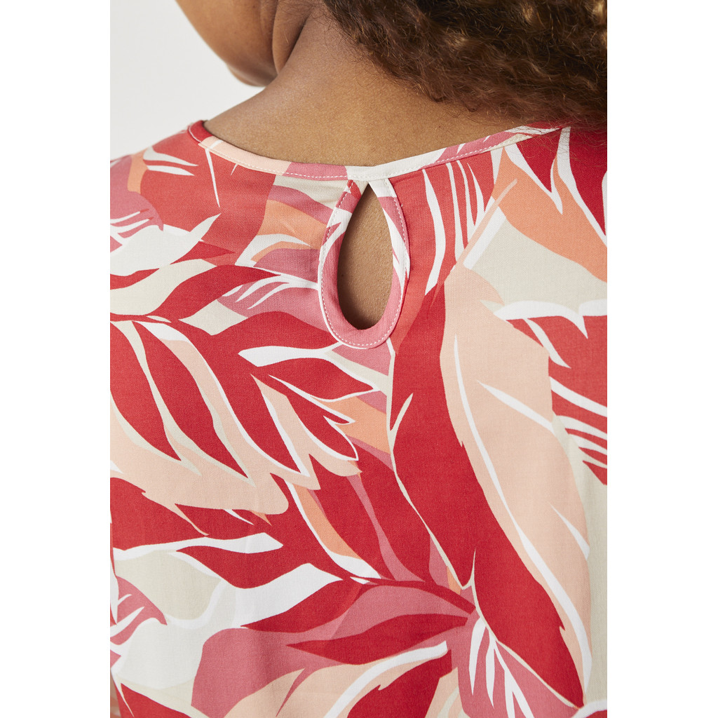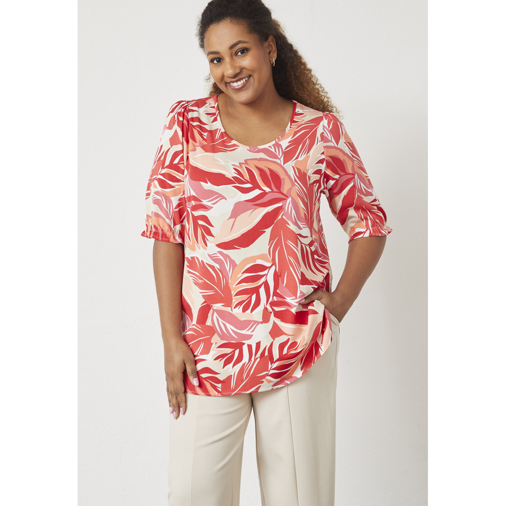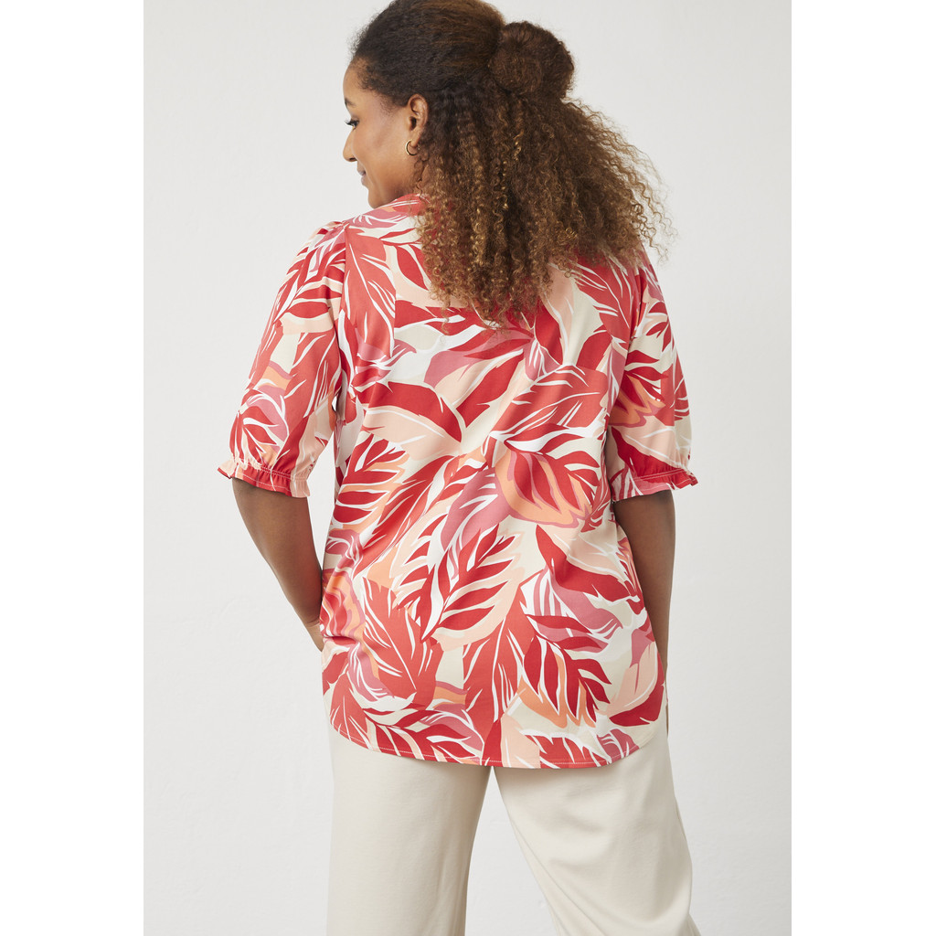 Pehme ja stiilne pluus julge, soojades punastes toonides leheteemalise mustriga. Sellel on lai ja mugav lõige ning A-kujuline siluett, mis sobib paljudele kehatüüpidele. Kerge ja veniv kangas lisab mugavust, samas kui ümar kaelus ja lühikesed varrukad annavad pingevaba ja naiseliku ilme.